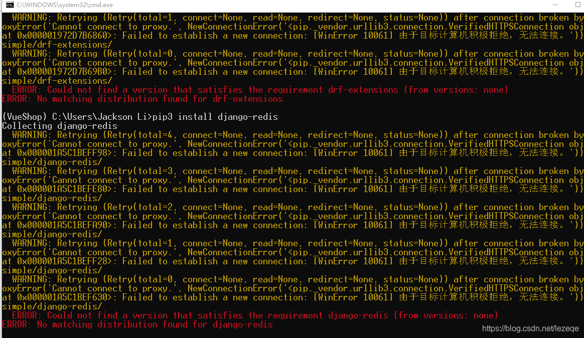 WARNING: Retrying (Retry(total=0, connect=None, read=None, redirect=None, status=None)) after connection broken by 'ProxyError('Cannot connect to proxy.', NewConnectionError(' : Failed to establish a new connection: [WinError 10061] 由于目标计算机积极拒绝,无法连接。')